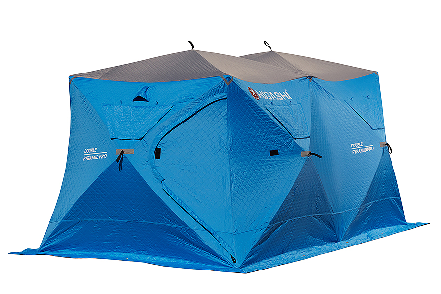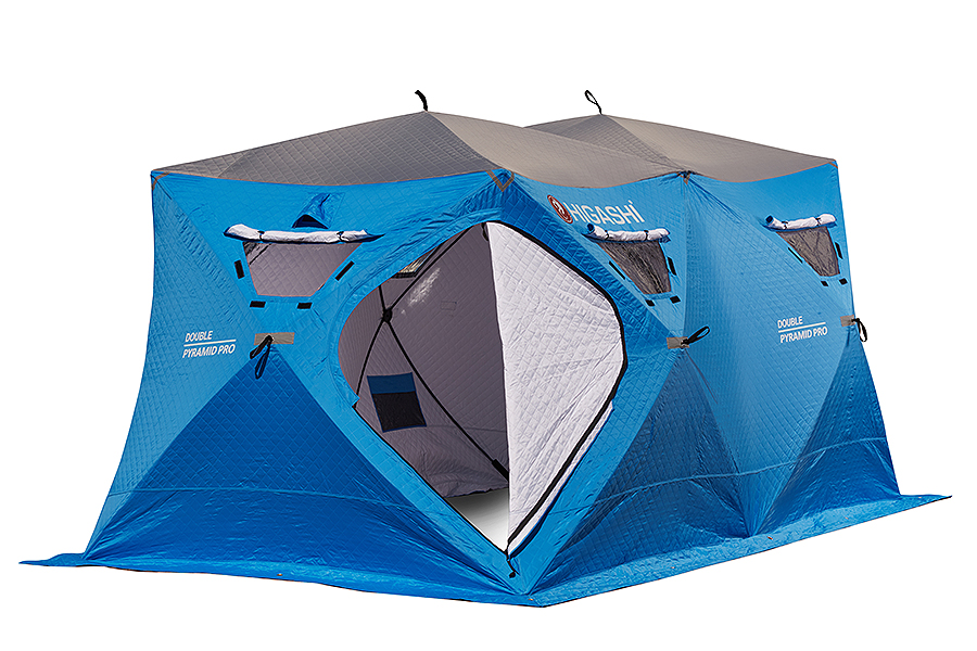 Сдвоенная утепленная трапециевидная зимняя палатка Higashi Double Pyramid Pro DC с новым сочетанием цветов. Внешняя сторона синяя, внутренняя - белая.