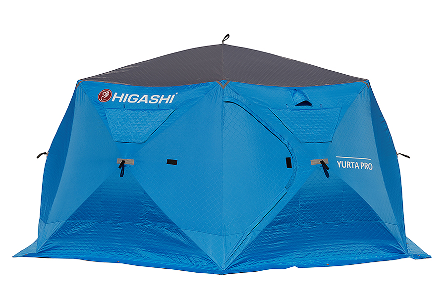 Утепленная зимняя палатка шестигранной формы Higashi Sota Pro DC с новым сочетанием цветов. Внешняя сторона синяя, внутренняя - белая.