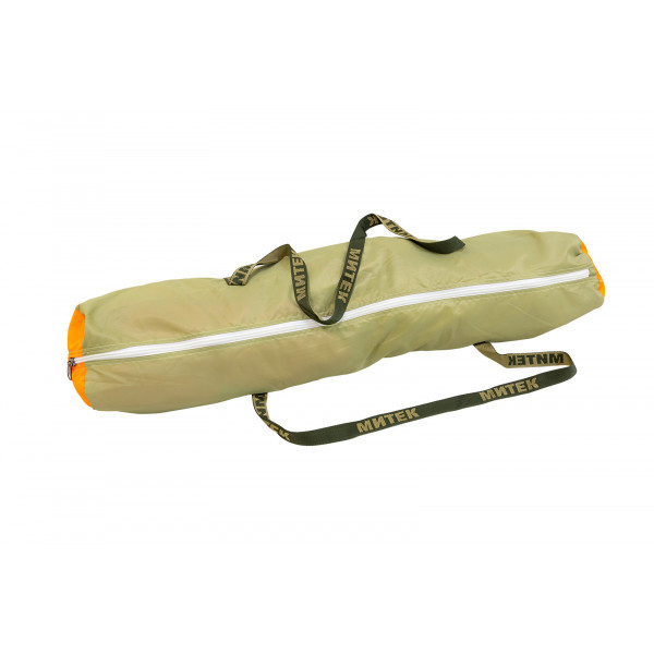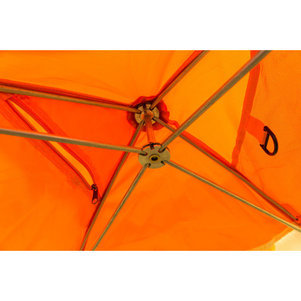 Сама палатка представляет собой каркас типа “зонт”, сделанный из дюралевого прутка 8 и 9 мм, и тента из водонепроницаемой ткани Оксфорд. Тент выполнен в традиционной оранжево-бежевой гамме. Все крепления стальные.